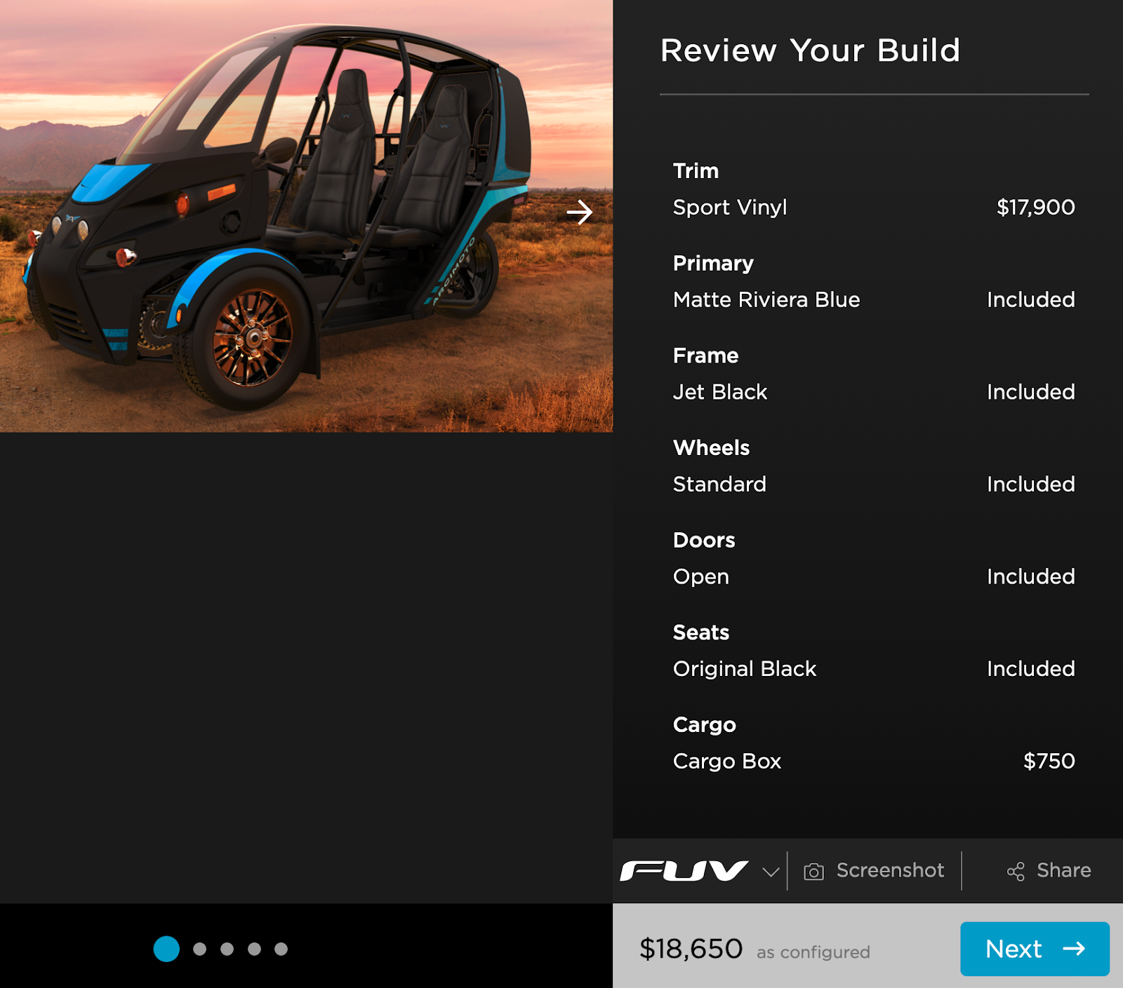 As I compare 3/4 wheel vehicles and low priced lithium ion vehicles currently available to purchase (not pre-ordered), I've found the FUV is actually priced far lower for what you get. With a cargo box (I feel it is necessary), no doors, and everything else standard including a 19 kwh lithium-ion battery pack, here is what you get for $18,650 plus taxes and fees (which can add up to another $2000):